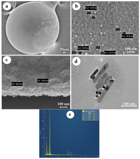 Morphological analysis of the surface of the ball resonator optical fiber coated with a ZnO layer: (a) SEM image of the optical fiber sensor showing its spherical shape and surface coating; (b) SEM image demonstrating the grain structure of the ZnO layer; (c) ZnO layer thickness on the surface of the optical fiber biosensor; (d) TEM image of ZnO; (e) EDS—surface analysis of the ball resonator optical fibers demonstrating the presence of Zn, O, C, and Si elements.