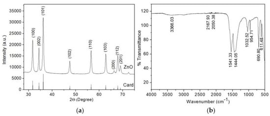 (a) X-ray diffraction pattern of ZnO layer; (b) FT-IR spectrum of ZnO layer.
