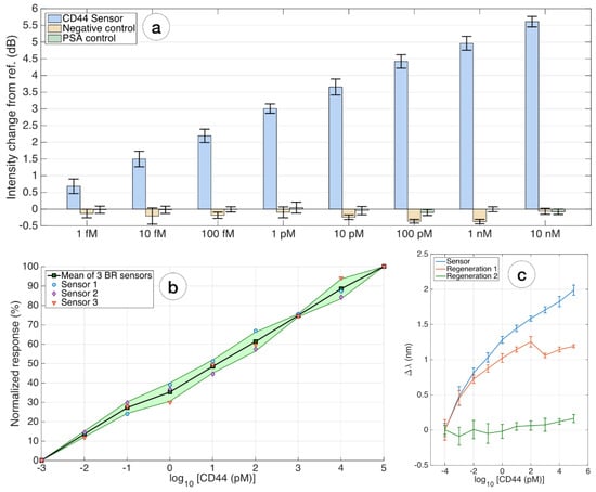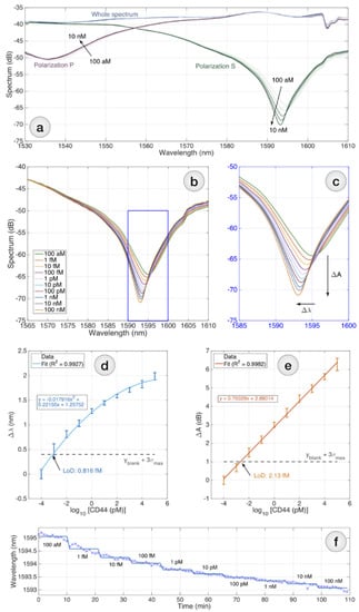 At the same time, the functionalized ball resonator was immersed in a vial containing 250 µL of a CD44 protein solution. Measurements for each concentration were carried out for 10 min. A total of 12 measurements, including all concentrations of CD44 protein, human serum, and PBS solution, were performed at each concentration. Figure 5a–c show the spectral response sampled after 5 min of S(green) and P (purple)polarization, for RI changes registered for CD44 concentration from 100 aM (bright curves) to 10 nM (dark curves), as well as wavelength shift diagrams (Figure 5d) and intensity change, measured for each CD44 concentration ranging from 100 aM to 100 nM (error bars = ±standard deviation reported over 11 consecutive measurements sampled every 1 min). The spectral response in the range where the sensor had the most sensitive response was integrated to determine the LoD of the sensor, which was calculated to be 2.13 fM (Figure 5e). The LoD was estimated using the method proposed by Chiavaioli et al. [47]: LoD = f −1 ( + ; where is the blank response hereby recorded at the lowest concentration of CD44, when the sensor is barely responsive, and is the maximum standard deviation.