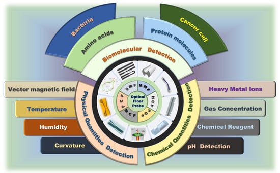 During the past five years, the above-mentioned new structure has been widely used in actual detection, involving different biomolecules [12], chemicals [13], and temperature [14]. This detection function can be used in a wide range of applications such as the water environment pH value and RI [15], various gases [16], and humidity [17]. In this section, the application of the plasma sensor based on the special optical fiber structure is introduced for biomolecular detection, chemical quantities detection, and physical quantities detection. In recent years, many studies on the applications of special optical fiber structures have been summarized to help facilitate understanding of related research progress as depicted in Table 2, Table 3 and Table 4.