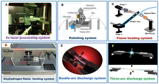Schematic of several kinds of common fiber-optic processing. (A). Fs laser processing system. Reprinted with permission from Optics and Lasers in Engineering, Copyright 2019, Elsevier [26]; (B). Polishing system. Reprinted with permission from Sensors, Copyright 2021, MDPI [48]; (C). Flame heating system. Reprinted with permission from Polymers, Copyright 2021, MDPI [49]; (D). Oxyhydrogen flame heating system. Reprinted with permission from Optics & Laser Technology, Copyright 2020, Elsevier [38]; (E). Two-arc discharge system. Refer to [50] (F). Three-arc discharge system. Reprinted with permission from Optics Express, Copyright 2021, Optica [51].