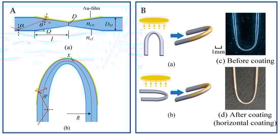 (A). Schematic diagram of the (a) straight and (b) U-shape of TPOF. Reprinted with permission from Optik, Copyright 2022, Elsevier [19]; (B). The schematic diagram of the coating results in the U-shaped probe based on POF (a–d). Reprinted with permission from Optik, Copyright 2022, Elsevier [19].