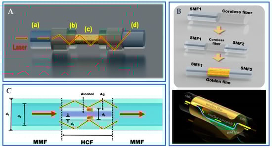 (A). The schematic of the sensor probe and each section of the probe: (a) single-mode fiber, (b) capillary fiber, (c) capillary fiber filled with ultraviolet curable adhesive, (d) step-index multimode fiber. Refer to [109]; (B). The structure fabrication process and schematic diagram of the etched structure. Reprinted with permission from Optics Letters, Copyright 2019, Optica [110]; (C). Schematic diagram of the MMF-HCF-MMF structure. Refer to [111].