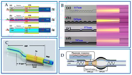 Jin et al. [128] investigated a new LSPR sensor for RI measuring based on MMF downward taper. The schematic of the downward taper is shown Figure 9D, which is formed by splicing two SMFs into an upper taper during heating by arc discharging and pushing by the two side clamps, and the optical fibers adjacent to the top taper area are then heated and pulled to generate a lower taper. This structure effectively improves the taper ratio, thereby improving the sensitivity. First, place the two MMFs on the fiber fusion splicer platform. During the discharge, the two MMFs push each other to form a taper. Then, heating and pulling make the fiber adjacent to the upper taper area gradually thinner. The structure has small volume, low cost, simple fabrication and high mechanical strength (waist diameter 40 μm). It is anticipated that it will be employed in the field of biochemistry.