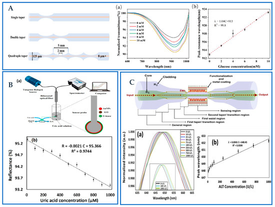 (A). The schematic of BP-TFG, inset (a) wavelength shift with different concentration of NSE samples at 0.01, 0.1, 1.0, 10, and 100 pg/mL, respectively, (b) linearity plot and (c) selectivity test. Reprinted with permission from Biosensors and Bioelectronics, Copyright 2019, Elsevier [137]; (B) the functionalize process of SMS, inset (a) quantity detection results of Salmonella typhimurium, (b) linearity plot. Reprinted with permission from Optical Fiber Technology, Copyright 2018, Elsevier [140]; (C). The schematic of MSM, inset (a) wavelength shifts under different M-IgG-decorated concentrations, (b) wavelength shifts about detecting different concentrations of GAM-IgG. Reprinted with permission from Biosensors and Bioelectronics, Copyright 2019, Elsevier [72].