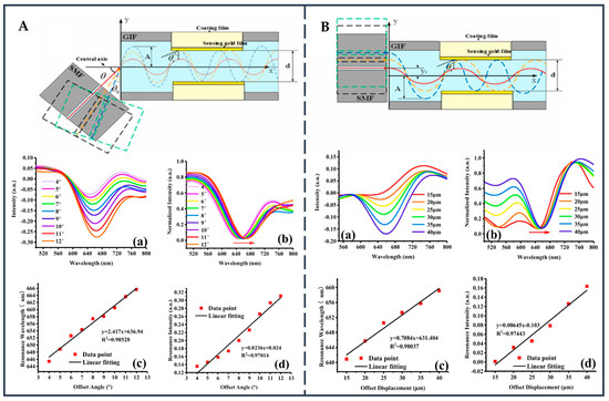 Wei et al. [127] proposed an S-shaped optical fiber strain sensor based on SPR and the structure as shown in Figure 9C. The S-shaped structure was prepared on the basis of SMF by electrofusion, and an Au film with a thickness of 50 nm was coated on the cladding surface behind the structure. The evanescent field of cladding mode contacts with the Au film to generate SPR, and the strain can change the vertical axis offset of the S-shaped optical fiber, thereby changing the incident angle of SPR, thus realizing a S-shaped optical fiber strain sensor based on SPR. Strain detection range is −1200 μϵ, and sensitivity is −14.38 pm/μϵ. The sensor provides a new method for strain measurement of fiber-optic SPR sensor.