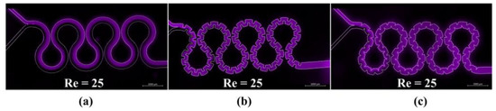 The fluorescence intensity maps of micromixer M1 (a), M3 (b), and M7 (c) at Re = 25 [6]. Copyright 2021, Elsevier.