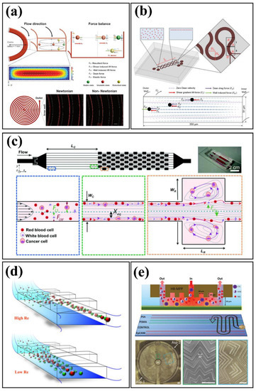 Inertial and secondary flow examples: (a) viscoelastic non-Newtonian spiral device, reprinted with permission from [44], Copyright 2021, Springer Nature; (b) serpentine device, reprinted with permission from [1], Copyright 2016, Springer Nature; (c) successive contraction and extraction channels, reprinted with permission from [38], Copyright 2013, Royal Society of Chemistry; (d) top surface slanted grooves configuration, reprinted with permission from [39], Copyright 2017, IEEE; and (e) Herringbone structure, reprinted with permission from [40], Copyright 2021, Wiley-VCH GmbH.
