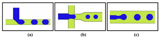Schematic design of different droplet generation geometries: (a) Crossflow, (b) Flow-focusing, and (c) Co-flow; adopted with permission from [53], Copyright 2022, IOP Publishing Ltd.