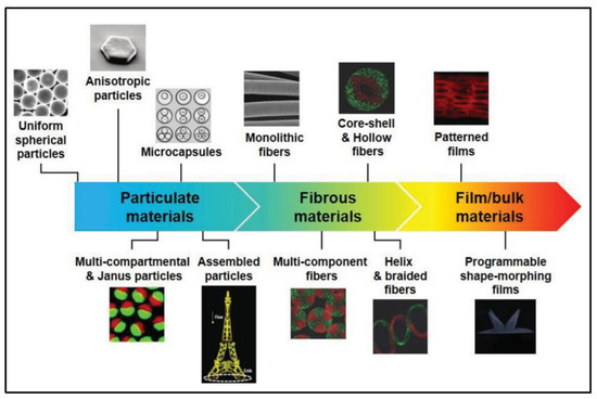 The behavior of fluids inside microfluidic devices is predominantly affected by interfacial parameters rather than gravity in microscale. Therefore, by designing different geometries and changing the operating conditions, it is possible to control fluid dynamics at the microscale level. Because of this feature, microfluidics have gained traction in the production of micro and nanomaterials for biomedical applications in different fields such as diagnostics, drug delivery, organs-on-chip, tissue engineering, and stimuli-responsive biodevices [60,61]. Microfluidic devices enable researchers to control the geometry, structure, and composition of the synthesized microfluidic-based micro/nano particles, fibers, films, and bulk materials. A common technique for preparing micro/nanoparticles using microfluidics typically involves two steps [62]: forming precursor droplets of uniform size, followed by solidification of droplets using different methods such as photopolymerization [63], heating and thermal curing [64,65], solvent evaporation [66], and ionic or chemical cross-linking [67,68]. Similarly, spinning micro/nanofibers through microfluidic devices comprising different fluids’ coaxial streams is accompanied by a curing step for the central or outer precursor stream [60,61]. In addition, incorporating microfluidic nozzles into three-dimensional printers allows precise control over the spatial distribution of fed inks to form heterogeneous compositions of two-dimensional films and customized three-dimensional structures [60] (Figure 6).