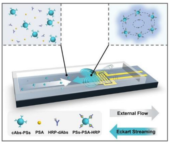 As opposed to separation, sorting of particles via particle focusing allows accumulation of particles to a point or straight line in active microfluidic applications under the influence of external forces. Focusing phenomena can support the separation of two distinct particle types with different sizes. By taking advantage of the size differences of the particles, large and small particles are subjected to greater or lesser force by the focused acoustic pressure point [122]. In acoustic separations, a pair of electrodes is slotted vertically on two sides of the microchannel, and a surface acoustic wave moves towards the microchannel [123]. Acoustic waves radiated from two opposite directions interfere with each other and generate standing waves that create pressure points at specific points depending on the wavelength inside the linear microchannel [124]. As in acoustic-based resonators and electric field manipulators [7,125], magnetic field-based manipulators [126,127] and optical field-based transducers [8,128] could generate gradients inside the microchannel to manipulate microparticles or nanoparticles for focus in a specific point, sorting in a specific path, and purifying to increase the density inside a content to be used, Figure 10.