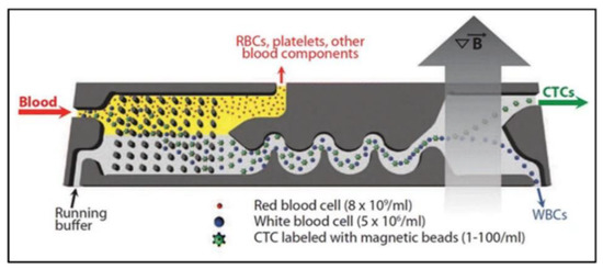 A view of particle sorting mechanism of white blood cells, red blood cells, and circulating tumor cells (CTCs) [128], Copyright 2018, Springer Open.