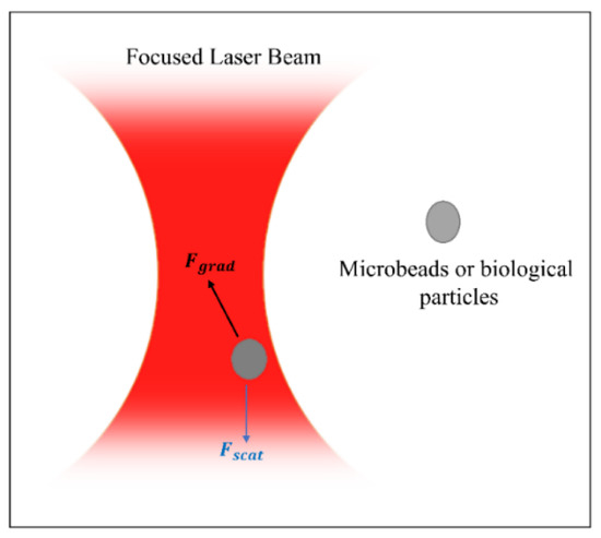 Particle trapping is an extraordinary method actively used in biomedical applications by creating physical tweezers depending on the acoustic field, electric field, magnetic field, optical field, or thermal field as a driving force in every particle manipulation method. Standing waves created by two identical interdigitated transducers are critical in acoustic method for creating a high-pressure point known as a tweezer that can trap different-sized particle, which could be micron- or sub-micron size particles [15,129,130]. Without standing waves, it is possible to confine silica nanoparticles, exosomes, and drugs inside a fluid chamber as rotating droplets for biomedical applications with the help of acoustic radiation force, acoustic microstreaming, and shear stresses [131]. Positive dielectrophoresis (pDEP) and negative dielectrophoresis (nDEP) tapping regions are determined by applied electric field distribution, which could be uniform or non-uniform. The particles, which have a lower polarizability (Re (K) < 0) than the surrounding medium, are driven towards the nDEP and vice versa [9,132]. Magnetic particles move to the low-energy region under the effect of the magnetic field gradient. When the energy distribution is examined, the trajectory of the particle can be predicted and controlled by manipulation of external magnetic energy [133,134]. The Joule heating-induced temperature gradient drives a controllable electric current to manipulate micron-sized particles [11]. In buoyancy-driven convection forces, the particles are pushed through the hot region by a negative Soret coefficient (), while the opposite is valid for positive [12]. Optical tweezing, also known as a single-beam gradient force trap, has the sensitivity of trapping a single molecule or a single nanoparticle and is frequently used in biomedical applications [17]. Depending on the refractive index of particles and surrounding medium, a laser beam creates attractive or repulsive forces [135], which can manipulate even dielectric and absorbing particles at the focal point, Figure 11, which is also known as beam waist [14,19,136].
