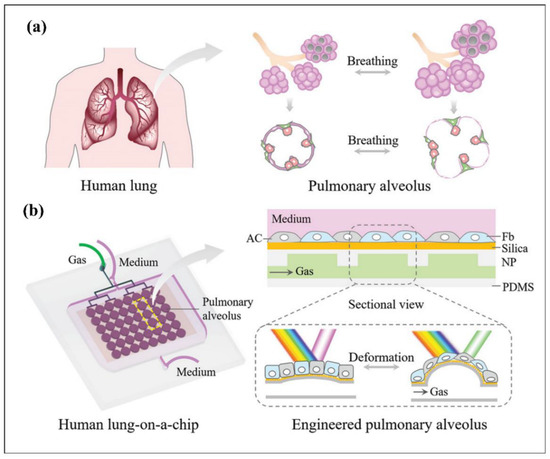 - Zhu, Y.; Sun, L.; Wang, Y.; Cai, L.; Zhang, Z.; Shang, Y.; Zhao, Y. A Biomimetic Human Lung-on-a-Chip with Colorful Display of Microphysiological Breath. Adv. Mater. 2022, 34, 2108972. [Google Scholar] [CrossRef]