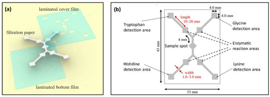 - Kugimiya, A.; Wakimoto, S.; Kohda, J.; Nakano, Y.; Takano, Y. Development of a One-Step Analysis Method for Several Amino Acids Using a Microfluidic Paper-Based Analytical Device. Sci. Rep. 2022, 12, 3427. [Google Scholar] [CrossRef]