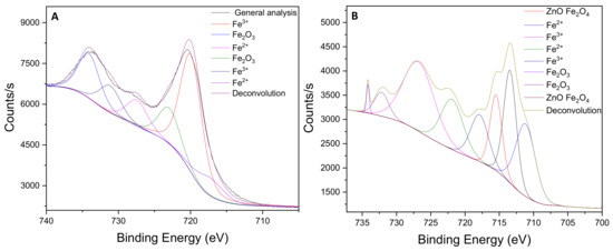 XPS analysis of γ-/α-Fe2O3 (Figure 2A) shows a first fine scan of Fe 2p, observing the binding energy of the electrons given in 2p3/2, 2p1/2 in the bands 711.45 eV and 734.41 eV, respectively [26]; the separation of the 2p doublet is 14.0 eV [27]. Specifically, the adjustment peaks that are located in the binding energies of 720.3, 724.2, 733.6, and 735.5 eV correspond to the tetrahedral Fe 2p3/2, octahedral Fe 2p3/2 structure, and the Fe 2p1/2 satellite structure, whereas in the energies 711.3, 713.2, 718.6, and 725.5 eV, there is a signal shift observed, which indicates a normal state of Fe3+ in the two samples [28]. In the analysis of γ-/α-Fe2O3/ZnO (Figure 2B), a second scan of Zn 2p was made, showing the peaks in the energy band 1022.1 and 1045.0 eV, which are attributed 2p3/2 and Zn 2p1/2, respectively, indicating that the oxidation state of Zn is 2+, whereas those located at 1021.4 and 1044.4 eV are attributed to Zn in the ZnO phase, as shown in the Supplementary Materials Figure S1C [29]. By the analysis of the material based on γ-/α-Fe2O3/ZnO (Figure S1), it was found that the corresponding signals for γ-Fe2O3 and α-Fe2O3 at 532.5 eV can be attributed to a chemisorption process, whereas the peaks located at 560.5 and 584.5 eV are associated with the oxygen of the network in the framework of metal oxides (Zn/Fe) [27]. In addition, the atomic percentages of Zn, Fe, and O were calculated and adjusted to the fine-scan spectra Zn, Fe, and O, showing the Zn/Fe/O ratio of 1:2:4 in Table S1.
