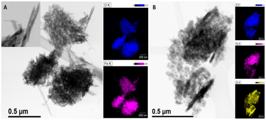 S/TEM and EDS mapping images of (A) γ-/α-Fe2O3 and (B) γ-/α-Fe2O3/ZnO nanoparticles.