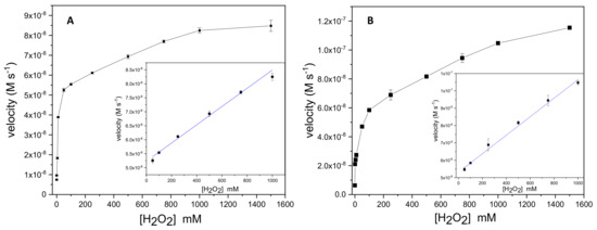Steady-state kinetic assays of the (A) γ-/α-Fe2O3 and (B) γ-/α-Fe2O3/ZnO. TMB concentration was maintained in 500 μM and H2O2 concentration was varied. Insets are the linearity of steady-state curves.