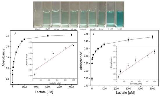 Lactate is a metabolite resulting from the anaerobic process of the respiratory chain in cells. Its quantifying is related to clinical diagnosis, the study of metabolic diseases, and continuous monitoring in sports medicine, trauma, and the food industry [1]. Lactate concentration is usually determined by HPLC, fluorometry, colorimetric tests [2], chemiluminescence, magnetic resonance spectroscopy, or electrochemical methods [3]. Each technique has certain advantages; although in some cases, the equipment is complex and expensive. In the case of colorimetric techniques, they are among the most required, because they are simpler and the equipment is economically accessible, but sometimes, its low sensitivity, quantification ranges, and limits of detection are parameters that are in constant investigation and improvement [4,5]. Conventionally, lactate has been quantified in blood or serum at concentrations of 0.5–2.5 mM, but this technique has the drawback that it is invasive to obtain the sample. Therefore, the trend in colorimetric quantification of lactate has been focused on sweat with concentration ranges from 15 to over 65 mM [6], although not all already reported sensors reach these quantifiable values [7]. Another of the biological fluids where the lactate could be measurable is the saliva, where the concentration varies between 0.11 to 0.56 mM, so it can be challenging to quantify it by colorimetric methods [8].