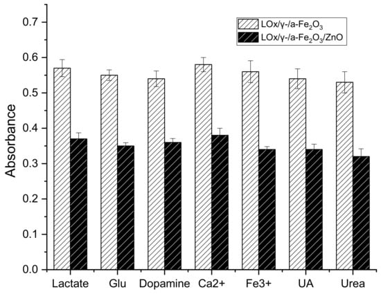 Furthermore, in order to evaluate the selectivity of the lactate sensor, γ-/α-Fe2O3 and γ-/α-Fe2O3/ZnO NPs were evaluated in the presence of different interferents. As can be seen in Figure 6, the absorbance was measured at 1 mM lactate in the presence of 0.5 mM of molecules that could interfere in the lactate quantification in biological fluids, such as dopamine (DA), acid ascorbic (AA), uric acid (UA), glucose (Glu), urea, and cations, such as Ca2+ and Fe3+ [49]. Using both Nps did not influence the lactate detection due to the Lox specificity and selectivity; however, by using LOx/γ-/α-Fe2O3/ZnO, the standard deviation values were lower. This result could be attributed to ZnO, which acts as a quenched agent for Fe+3 and for organic molecules such as dopamine [50,51].