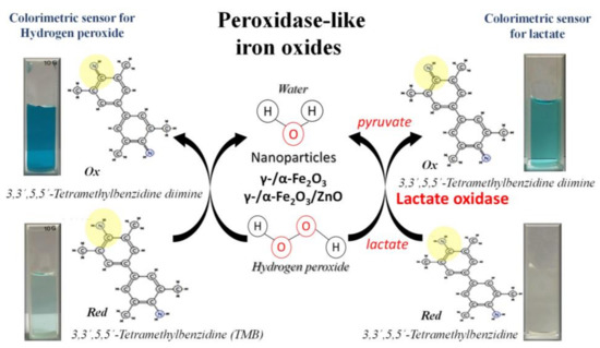 For the colorimetric quantification of lactate, the lactate oxidase enzyme (LOx) is usually used, where pyruvate and hydrogen peroxide (H2O2) result as secondary products. From this reaction, H2O2 is used as a substrate to react with a metal or metallic oxide with peroxidase-like activity and a chromogenic substance such as TMB that can be measured by UV-Vis spectroscopy [4]. Peroxidase-like iron oxides or iron-modified oxides have preferably been used due to their catalytic activity that depends on their intrinsic properties. These materials are also economically more viable compared to precious metals such as gold [9,10] or silver [11,12]. The peroxidase-like activity of Fe3O4 followed a trend of spheres > triangular plates > octahedral [13], with a smaller size to 30 nm [14,15] that has been published. Fe2O3 has also been reported from alpha and gamma phases, although with a low peroxidase-like activity for this last phase [16,17]. Binding with another material such as CeO2, CuO, Co3O4, V2O5, and ZnFe2O4 [18] can increase the catalytic activity. In addition, using other types of oxides, such as SiO2 or ZnO, facilitates a union with proteins improving mechanical and photovoltaic properties [19,20].
