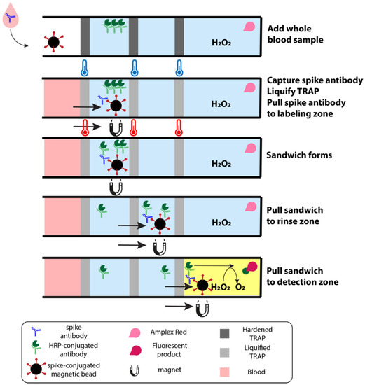 We have recently shown that we can use TRAPs as stationary partitions that continually separate reagents but are permeable to magnetic beads, thus enabling magnetic microbeads to transport bound molecules across the partition [25]. Here, we have specifically demonstrated use of TRAPs in our sample-to-answer magnetofluidic assay to quantify antibodies against the spike protein of SARS-CoV-2. Our assay contains five separate assay sections (1 capturing zone, 1 labeling zone, 2 rinse zones, 1 detection zone), thus our final design requires four stationary TRAPs that are permeable to magnetic beads (Figure 3). The first zone houses magnetic beads functionalized with SARS-CoV-2 spike proteins to capture anti-spike antibodies in the blood sample. Upon melting the TRAPs, the antibodies captured on magnetic beads are pulled through the permeable TRAPs by an external magnet, thus transporting the antibodies from whole blood into another aqueous layer containing HRP-conjugated secondary antibodies, which bind to the captured SARS-CoV-2 spike protein antibodies. This complex is pulled through another permeable TRAP and into the phosphate buffer. This rinse zone greatly dilutes any unbound secondary labeling antibodies pulled through the TRAP in the hydration layer around the bead slug. This automation allows us to minimize the number of manual steps, which are required in the gold standard equivalent (ELISA). Finally, the bead complex is pulled into a detection zone containing Amplex Red and hydrogen peroxide. HRP (tagged onto the labeling antibody) converts Amplex Red into fluorescent resorufin, thus producing a fluorescent signal that is directly proportional to the concentration of anti-spike antibodies. In this work, the total assay time is 70 min; however, this can be greatly decreased in a commercial device by optimizing the incubation times.