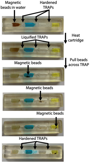 Figure 3. Photos of magnetic beads pulled through TRAPs in cartridge. The cartridge is heated to melt the TRAPs. Once liquified, the magnetic beads are pulled through each of the permeable barriers. The cartridge is removed from heat and the TRAPs harden.