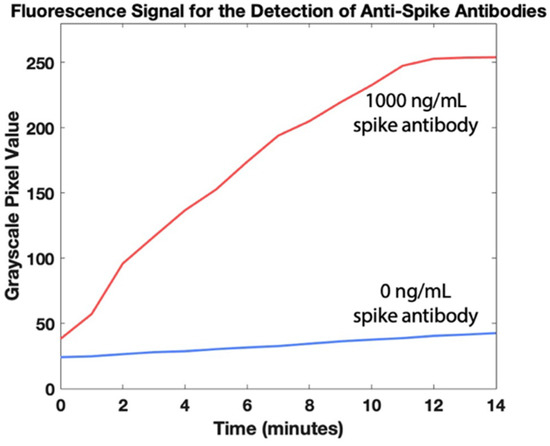 After optimization of the cartridge geometry and assay conditions, we ran the full assay to analyze blood samples spiked with a range of concentrations of antibodies against the SARS-CoV-2 spike protein. Following a 30-min incubation once the whole blood sample is added to allow beads to capture antibodies against the SARS-CoV-2 spike protein, the cartridge is placed in the portable fluorescence reader atop the portable heater. The bead slug is pulled through the immunoassay and into the detection zone as shown in Figure 3. The heater turns off and the fluorescence is imaged by the camera 10 min after the beads reach the detection zone. The real-time fluorescence data in Figure 4 demonstrates that signal saturation is achieved after about ten minutes.