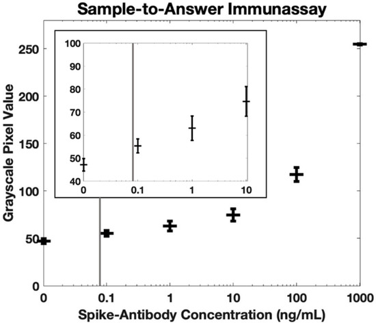 Figure 5 shows the measured fluorescence intensity for antibody concentrations in whole blood between 0 ng/mL and 1000 ng/mL. Using the International Union for Pure and Applied Chemistry (IUPAC) definition of the limit of detection (the concentration that generates a signal with a mean that is separated from the mean of the blank by three standard deviations of the blank), the calculated limit of detection for our sample-to-answer assay is 84 pg/mL. Similarly, using the International Organization for Standardization (ISO) definition for the limit of detection (5% error on the blank and 5% error on a positive sample with the lowest concentration that is identifiable as positive [30]), the calculated limit of detection is 102 pg/mL. All values for detection limit are significantly lower than the reported range of anti-spike antibodies in whole blood [26,27,28,29], demonstrating that this system is clinically relevant.