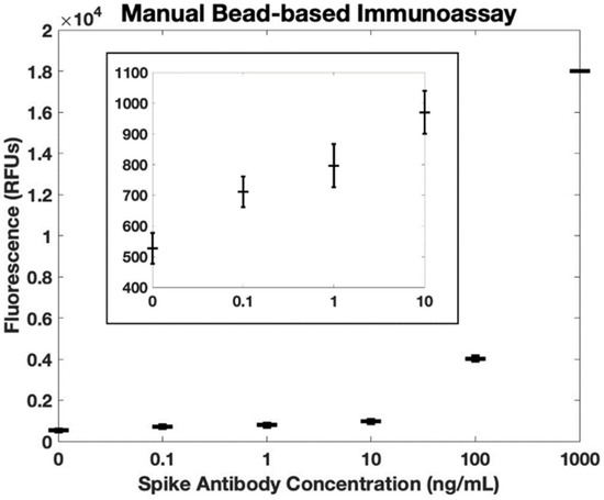 Figure 6. Fluorescence quantification of antibodies against SARS-CoV-2 spike protein in whole blood using a bead-based immunoassay with manual rinse steps and a benchtop plate reader (n = 3). The calculated detection limit is 68 pg/mL using the IUPAC definition. Error bars are +/− 1 standard deviation. The insert shows the same dataset, but on a smaller scale.