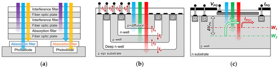 Figure 1b shows a method of multi-wavelength analysis using a single pixel and a CMOS buried quad p-n junction photodiode structure [25,26]. Because the light wavelength has a different absorption depth depending on the silicon absorption coefficient, it is possible to separate the wavelength by measuring the current that is generated at each p-n junction. Furthermore, because the structure of such a buried multi-p-n junction can detect a wavelength in a single pixel, it has a higher fill factor than a CMOS image sensor with an integrated RGB filter does. Therefore, it provides a high-resolution fluorescence image in the biofield. However, the wavelength and band numbers were fixed according to the buried p-n junction numbers and their depth.