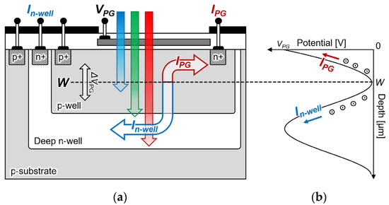 Figure 2a shows a schematic of the proposed filter-free wavelength sensor that was obtained by changing the substrate from an n-type to a p-type silicon substrate in the double-well structure. The sensor proposed a three-layer structure where a deep n-well and p-well were formed on a p-sub silicon substrate to measure the electrons generated by light passing through W. A photogate structure was adopted as in the conventional structure, and an n+ diffusion layer was deposited on the deep n-well to detect the electrons generated at a position that was deeper than W. Therefore, the peripheral circuit characteristics do not change by providing the n-well in a region that is different from the deep n-well, and the sensor and peripheral circuit can be integrated. Because measuring the light that is passing through the saddle point W with a photocurrent is also possible, a quantum efficiency that is higher than that of an n-type silicon substrate sensor can be expected. Furthermore, because the potential depth position can be freely moved while maintaining the potential distribution steeply by the photogate voltage and body biasing, a high sensitivity can also be expected by optimizing the wavelength that is to be detected.
