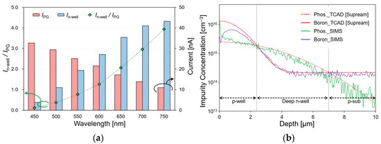 A three-dimensional device simulation was conducted using SPECTRA (Link Research, Japan) to evaluate the current characteristics and effectiveness of the sensor with the proposed structure. The light source conditions that were irradiated to the sensing area had a diameter of 100 μm, a light intensity of 1 mW/cm2, and a wavelength in the 450–750 nm range. Figure 3a shows the change in the IPG and In-well current and its current ratio according to the wavelength. As the wavelength increased, the penetration depth of the light irradiated onto the silicon substrate increased. Therefore, the surface–side current IPG decreased and the substrate current In-well increased. The simulation results indicate that the current ratio in the 450–750 nm wavelength range changed from 0.09 to 3.96. Consequently, we were able to identify the wavelengths in the visible light region by calculating the respective current ratios.
