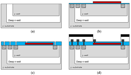 Cross-sectional schematic of the sensor fabrication process. (a) A p-type 4-in silicon wafer (60 Ω/cm) is ion-implanted and driven in under the conditions that are shown in Table 1 to form a double-diffusion well structure; (b) the gate oxide film of 60 nm and Poly-Si of 350 nm are deposited, and the gate electrode is formed by phosphorous diffusion; (c) 400-nm-thick Tetra ethoxy silane (TEOS) is deposited by low-pressure chemical vapor deposition (LP-CVD), and contact holes are opened by oxide film etching; (d) after Al wiring, a light shielding film is formed by Al sputtering of 1.0 µm outside the sensing area.