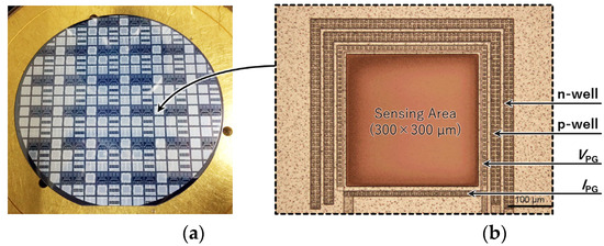 Figure 4 shows the fabrication process of the sensor. The proposed double-well structure sensor was fabricated using the 1-polysilicon, 2-metal process at the LSI facility in the Toyohashi University of Technology, Japan. The drawing rule used 5 μm, and the wafer used a 4-in p-silicon substrate (P100, 60 Ω/cm, 2.24 × 1014 cm−3). Figure 5 shows the processed wafer and microscope images of the sensor (300 × 300 µm).
