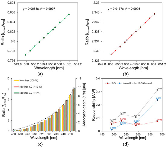 To measure the wavelength resolution of the sensor, the current ratios of IPG and In-well were measured when 0.1 nm increments changed the incident wavelength from 550 nm and 650 nm, as shown in Figure 6a,b, respectively. As the wavelength shifted by 1 nm, the current ratios of 0.0083 and 0.0167 changed at 550 nm and 650 nm, respectively. Additionally, the coefficient of determination was 0.999. Because the change in the current ratio according to the noise of the sensor measurement system occurred at a decimal point of fewer than four digits, the wavelength resolution of the sensor was expected to be 0.1 nm or more.