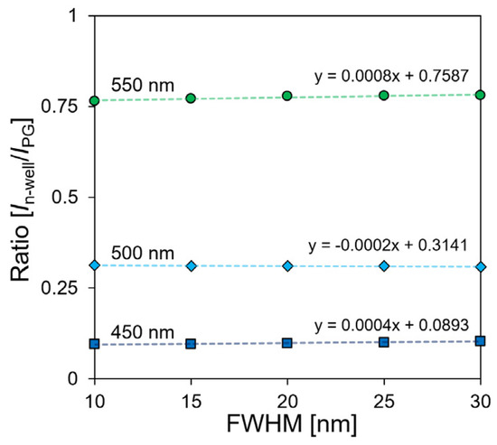 A programmable light source (OSVISX, OneLight Spectra, Vancouvar, BC, Canada) was used to evaluate the current ratio owing to the FWHM change of a single wavelength. The current ratio was measured by irradiating three light sources with central wavelengths of 450, 500, and 550 nm and a light intensity of 15 mW/cm2. Figure 7 shows the result of measuring the FWHM of the light source five times every 5 nm from 10 nm to 30 nm. Based on the current ratio at a wavelength of 500 nm, which was used as a reference, when the FWHM increased from 10 nm to 30 nm, the current ratio changed by −0.004, and the error rate was 1.48%. In a previous study on a single-well structure, the error rate was approximately 5.11%, and it was reduced by approximately 3.63% [28]. This result confirmed that the proposed sensor has low dependence on the change in FWHM when it is compared to the single-well structure sensor.