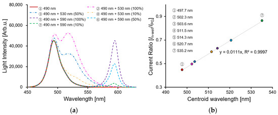 (a) Spectral characteristics by LED light source 490 nm, 490 + 530 nm, and 490 + 590 nm. The 490, 530, and 590 nm light intensities are 16.98, 13.44, and 22.66 µW/cm2, respectively. The 530, and 590 nm LED light sources changed the light intensity by 100, 50, and 10%; (b) the relationship between centroid wavelength by spectrum and current ratio.