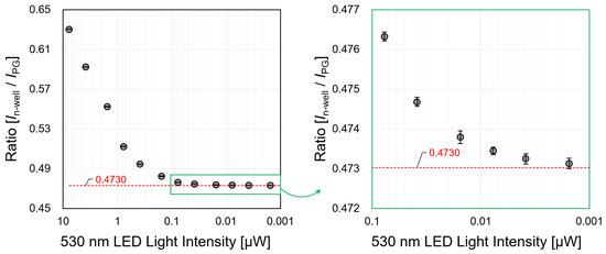 In the case of a fluorescence experiment, the intensity of the emitted light (fluorescence) is weaker than the excitation light is. We evaluated the wavelength separation ability of the sensor using two light sources (λ: 490, 530 nm). The wavelength separation ability was calculated by detecting the change in the current ratio according to the wavelength. The intensity of the exciting light (490 nm) was fixed at 7.714 µW, and only the fluorescence light source (530 nm) was reduced from 7.709 µW to 0.0008 µW. The standard deviation average value of the current ratio was calculated to be 0.00015 from the results of each measurement which were taken ten times. Therefore, we considered that the practical measurement value of the current ratio is a measurable ratio of up to four decimal places. Figure 9 shows the current ratio change according to the light intensity. It is considered that the separation ability of 490 nm and 530 nm can be measured up to 1977.95: 1 if up to four decimal places are assumed as significant digits. This result has a higher sensitivity than the 1300:1 measured value of the wavelength separation ability of the presented sensor with an n-type silicon substrate [28].