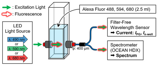 This study detected various fluorescent reagents without optical filters using a single-pixel sensor. The fluorescent reagents Alexa Fluor 488, 594, and 680 (AF488, AF594, and AF680, Thermo Fisher, Waltham, MA, USA) were used to evaluate the fluorescence wavelength detection ability of the sensor. The reagent was maximally excited at wavelengths of 490, 590, and 679 nm, and the emitted fluorescence at the wavelengths of 525, 612, and 702 nm, respectively. Figure 10 shows a schematic of the experimental system which was built to perform a quantitative evaluation. The peak wavelengths of the LED light source (M490F3, M590F3, M680F3, Thorlabs, Newton, NJ, USA) that were used as excitation light sources were 490, 590, and 680 nm (FWHM: 26, 16, and 22 nm), and the light intensities were 21.28, 15.05, and 13.60 µW/cm2, respectively. The reagent that was to be analyzed was 2.5 mL of deionized water (DIW) and seven types of fluorescent reagents (10, 5, 2, 1, 0.5, 0.2, and 0.1 μM) in a standard quartz cell (T-5-UV-10, TOSOH, Japan). The excitation light and fluorescence passing through the quartz cell were irradiated onto the sensor and spectrometer (OCEAN HDX, Ocean Photonics, Tokyo, Japan) using a two-branch optical fiber (BIF600-UV/VIS, Ocean Photonics, Japan), and the current and spectral characteristics of the sensor were measured simultaneously. The fluorescent reagent measurements were conducted in a dark room at room temperature.