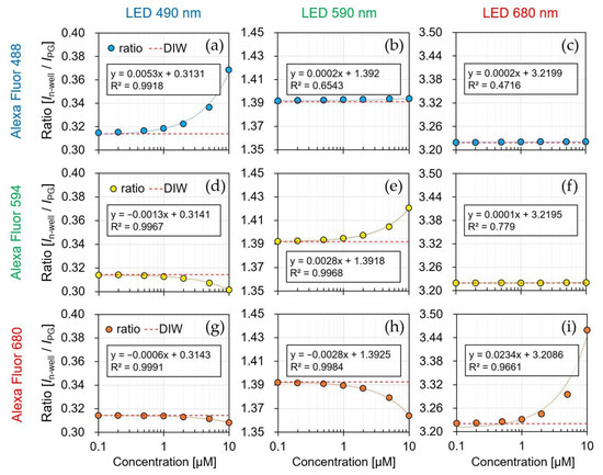 Current ratio by the concentration of fluorescent reagent. (a) AF488-λem: 490 nm; (b) AF488-λem: 590 nm; (c) AF488-λem: 680 nm; (d) AF594-λem: 490 nm; (e) AF594-λem: 590 nm; (f) AF594-λem: 680 nm; (g) AF680-λem: 490 nm; (h) AF680-λem: 590 nm; (i) AF680-λem: 680 nm.