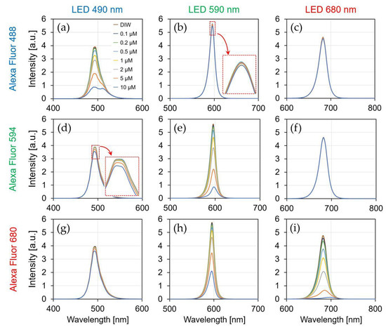 Spectral characteristic by the concentration of fluorescent reagent. (a) AF488-λem: 490 nm; (b) AF488-λem: 590 nm; (c) AF488-λem: 680 nm; (d) AF594-λem: 490 nm; (e) AF594-λem: 590 nm; (f) AF594-λem: 680 nm; (g) AF680-λem: 490 nm; (h) AF680-λem: 590 nm; (i) AF680-λem: 680 nm.