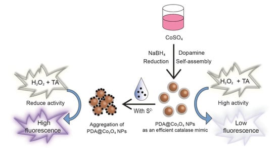 Herein, we developed polydopamine (PDA)-coated Co3O4 NPs (PDA@Co3O4 NPs) as highly active catalase-mimicking nanozymes and applied these NPs in fluorescent detection of S2−. PDA can be produced through self-polymerization of dopamine (DA) without the involvement of any organic solvent, yielding unique adhesion properties based on its active catechol and alkane groups, to facilitate substrate adsorption and product desorption in diverse reactions [,,]. The synthesized PDA@Co3O4 NPs showed high catalase-like activity in degrading H2O2, which inhibited the formation of extremely fluorescent 2-hydroxy terephthalic acid, to decrease the fluorescent signal. Interestingly, S2− in the sample may interact with PDA@Co3O4 NPs, resulting in decreased catalase-like activity via increased substrate transfer limitations and a decreased available surface area for catalytic events. We detected the target S2− in a PDA@Co3O4 NPs-based fluorescent assay and investigated various analytical characteristics, such as selectivity, sensitivity, stability, and practical utility along with the detection precision.