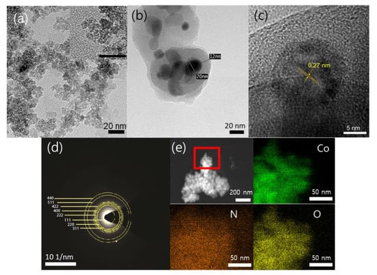 Structural characteristics of PDA@Co3O4 NPs were analyzed and compared with those of bare Co3O4 NPs without a PDA shell by TEM and SEM images. Bare Co3O4 NPs had spherical shape with 20.03 ± 2.82 nm diameter, calculated from their TEM images, and importantly, relatively thick (~15 nm) shells were clearly observed outside the core NPs from the PDA@Co3O4 NPs (Figure 2a,b). In basic conditions, DA is known to easily interact with the surface of the NPs by a variety of interactions, including electrostatic interaction, metal coordination, and hydrogen bonding, and induce its polymerization among another DA monomers [,,,,,]. Thus, it was believed that the layer around the Co3O4 NPs was PDA shell, as also clearly observed in the SEM images (Figure S1 in Supplementary Materials). As the concentrations of DA increased, the thickness of polymeric shell concomitantly increased, which was similar to the previous studies (Figure S2) [,]. High-resolution TEM (HRTEM) imaging and selected area electron diffraction imaging (SAED) demonstrated the presence of crystalline Co3O4 in PDA@Co3O4 NPs, which fit well with the reported data (JCPDS no. 76–1802) (Figure 2c,d). EDX images also proved the presence of Co, N, and O, which were well distributed throughout the material (Figure 2e). The elemental composition ratios within the PDA@Co3O4 NPs are provided in Table S1.