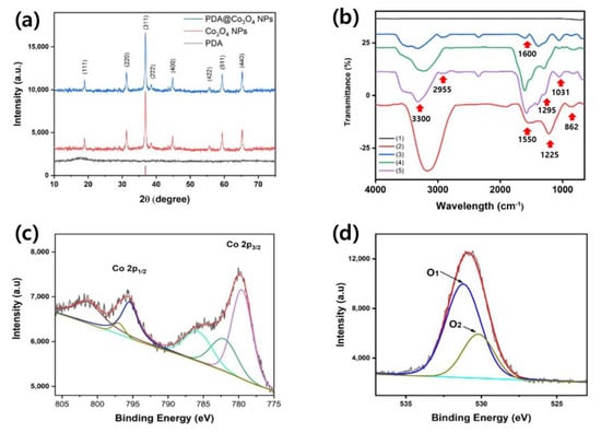 (a) XRD spectra, (b) FT-IR spectra of bare Co3O4 NPs, PDA, 0.5−PDA@Co3O4 NPs, 1−PDA@Co3O4 NPs, and 2−PDA@Co3O4 NPs (denoted as 1, 2, 3, 4, and 5, respectively), and high-resolution XPS spectra of PDA@Co3O4 NPs for (c) Co 2p and (d) O 1s.