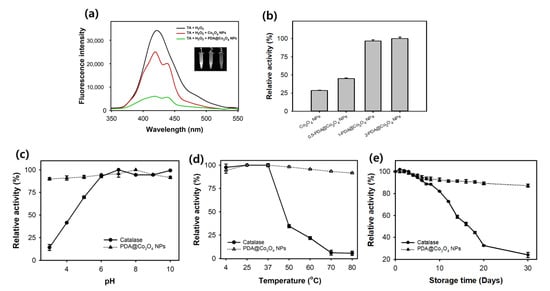 Under the optimized conditions, stabilities of PDA@Co3O4 NPs, depending on the pH, temperature, and storage time at RT, were assessed and compared with those of natural catalase. As expected, under all conditions, PDA@Co3O4 NPs clearly showed improved stabilities, maintaining over 90% of their initial activity, while natural catalase lost over half of its activity under harsh conditions (acidic pH below 4, temperature over 50 °C, and storage over 15 days) (Figure 4c–e). The clear improvement in the stability of PDA@Co3O4 NPs is beneficial for their practical applications.