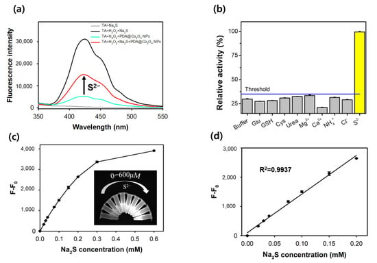 PDA@Co3O4 NPs with enhanced catalase-like performances were utilized to fluorescently detect environmentally harmful S2−. In the absence of S2−, TA-mediated fluorescence was significantly decreased because of the high catalase-like activity of PDA@Co3O4 NPs (Figure 5a). In the presence of S2−, the fluorescence was clearly restored due to the significant reduction in the activity of PDA@Co3O4 NPs. The S2−-mediated reduction in activity may have occurred because of the interaction of S2− on the PDA surface and subsequent inhibition of H2O2 decomposition, resulting in an increased TA-mediated fluorescence signal. The PDA@Co3O4 NPs-based S2− biosensing system showed high selectivity for S2− (50 μM), while diverse interfering compounds such as small molecules (glucose, urea), biothiols (glutathione, cysteine), and common ions (Mg2+, NH4+, Ca2+, Cl−) did not have any considerable signal (below the threshold line), even at tenfold higher concentrations (Figure 5b), confirming that the biosensing strategy selectively detected target S2−. On increasing the concentrations of S2−, fluorescence intensity gradually increased (Figure S7). From the analysis of dose–response curves, the LOD was calculated as low as 4.3 µM with the linear range up to 200 µM (Figure 5c,d), which is sufficient for practical S2− biosensing in the field [,].