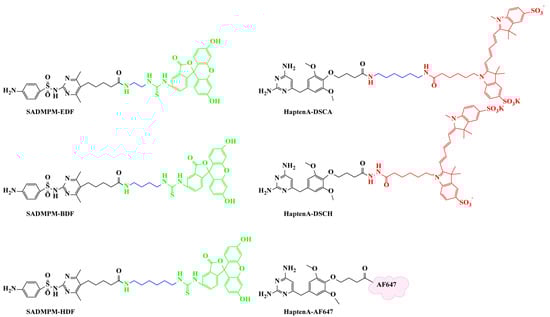 Sulfamethazine (SMZ), sulfisomidine (SIM), sulfadimethoxine (SDM), sulfadoxine (SDM’), sulfamethoxydiazine (SMD), sulfamonomethoxine (SMM), sulfalene (SLE), sulfamethoxypyridazine (SMP), sulfaethoxypyridazine (SEP), sulfamerazine (SMR), sulfadiazine (SD), sulfabromomethazine (SBM), sulfachlorpyrazine (SCY), sulfachloropyridazine (SCP), sulfaquinoxaline (SQX), sulfapyridine (SPY), sulfabenzamide (SBA), sulfamoxole (SXL), sulfisoxazole (SIZ), sulfamethoxazole (SMX), sulfathiazole (STZ), sulfamethizole (SMT), and sulfaphenazole (SPA) were supplied by Millipore Sigma (St. Louis, MO, USA). Trimethoprim (TMP), diaveridine (DVD), and ormetoprim (OMP) were supplied from Dr. Ehrenstorfer GmbH (Ausburg, Germany). Brodimoprim (BOP) was supplied by J & K Chemical Technology (Beijing, China). Baquiloprim (BQP) was purchased from Sigma-Aldrich (St. Louis, MO, USA). Fluorescein derivatives, including fluoresceinthiocarbamyl ethylenediamine (EDF), fluoresceinthiocarbamyl butanediamine (BDF), and fluoresceinthiocarbamyl hexamethylenediamine (HDF), were synthesized in our study [17]. Disulfo-Cy5 amine (DSCA) and disulfo-Cy5 hydrazide (DSCH) were acquired from Confluore Biological Technology Co., Ltd. (Shanxi, China). Alexa Fluor 647 cadaverine was supplied by Thermo Fisher Scientific Inc. (Waltham, MA, USA). Haptens SADMPM and HaptenA were previously synthesized in our laboratory.