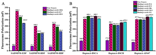 The detection system of DWFPIA consists of two distinct fluorescence signals; moreover, the interference between the short-wavelength fluorescein (EDF/BDF/HDF) and the long-wavelength fluorescein (DSCA/DSCH/AF647) could be ignored, according to our previous studies [26,38]. Furthermore, the nonspecific binding was analyzed by comparing the FP changes of each tracer (or the tracer cocktail) upon the addition of the free, specific, non-specific, and cocktail mAbs at working concentrations. As shown in Figure 3A, the FP value of the free tracer SADMPM-HDF was 67.9 mP at 480 nm/535 nm, and the FP values had no significant difference with the addition of the non-specific mAb 9C9. Moreover, the FP values were significantly increased when the specific mAb 10E6 and cocktail mAbs of 10E6 and 9C9 were added with FP values of 178.6 mP and 178.8 mP. The results showed that the increased FP values of SADMPM-HDF were mainly caused by the specific mAb 10E6 and were not affected by the non-specific mAb 9C9. At 620 nm/688 nm, the binding of the tracer HaptenA-DSCA and its corresponding antibody mAb 9C9 was not affected by the presence of non-specific mAb 10E6, as shown in Figure 3A. Similar results were also observed in the cocktail tracers, as shown in Figure 3B. The results indicate that the mixture of two tracers and two antibodies did not have non-specific binding with each other.