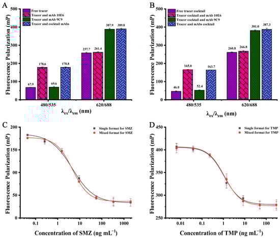Binding of the single tracer (A) and the tracer cocktails (B) with mAbs at the working concentration. Standard curves for SMZ, TMP, and the standard cocktail in mixed format at different wavelengths: (C) λex 480 nm/λem 535 nm (n = 3); (D) λex 620 nm/λem 688 nm (n = 3).